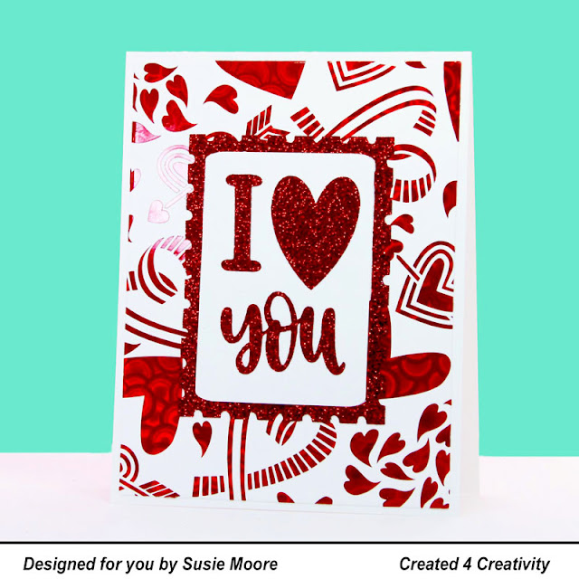 Here is another card created with my Cricut Maker. I had all of these holographic hearts left over from another project, so I decided to use them on a card. Peel and stick for the win. Then I used some Glitter HTV to make my sentiment and frame. Easy peasy!